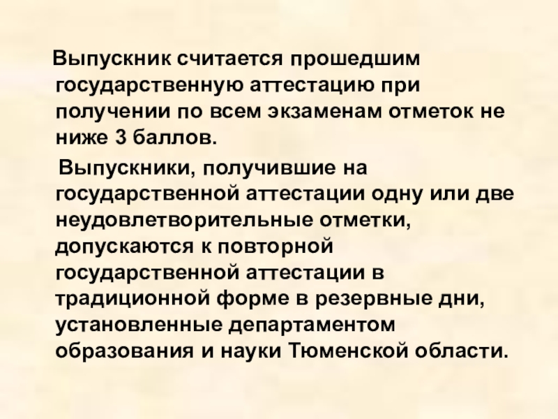 Выпускники, получившие на государственной аттестации одну или две неудовлетворительные отметки, допускаются к повторной государственной аттестации в традиционной форме в резервные дни, установленные департаментом образования и науки Тюменской области.