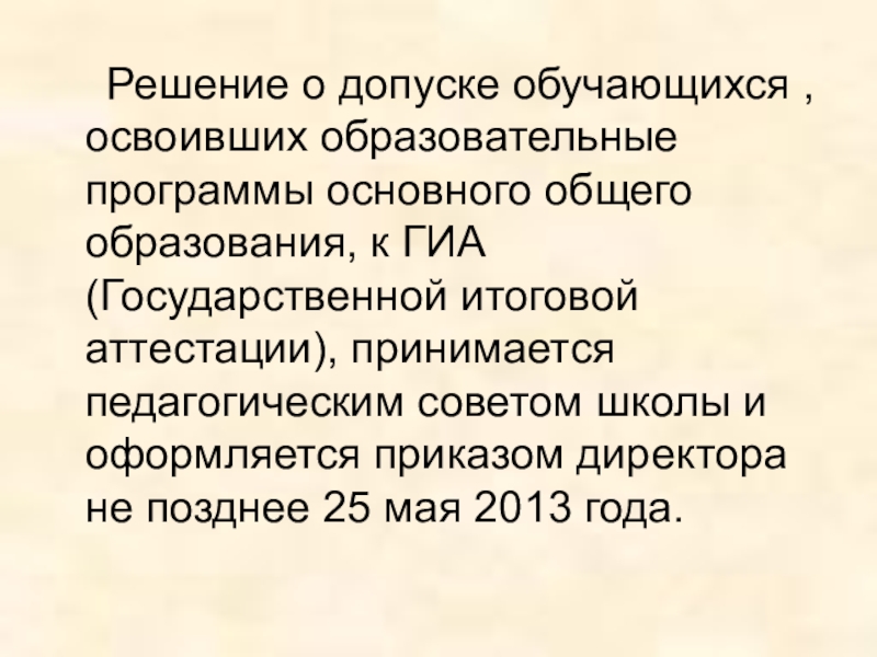 основного общего образования, к ГИА (Государственной итоговой аттестации), принимается педагогическим советом школы и оформляется приказом директора не позднее 25 мая 2013 года.