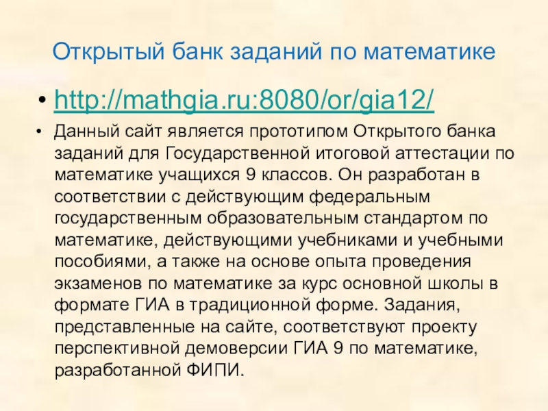 для Государственной итоговой аттестации по математике учащихся 9 классов. Он разработан в соответствии с действующим федеральным государственным образовательным стандартом по математике, действующими учебниками и учебными пособиями, а также на основе опыта проведения экзаменов по математике за курс основной школы в формате ГИА в традиционной форме. Задания, представленные на сайте, соответствуют проекту перспективной демоверсии ГИА 9 по математике, разработанной ФИПИ.