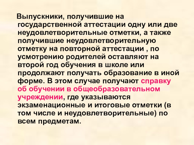 отметки, а также получившие неудовлетворительную отметку на повторной аттестации , по усмотрению родителей оставляют на второй год обучения в школе или продолжают получать образование в иной форме. В этом случае получают справку об обучении в общеобразовательном учреждении, где указываются экзаменационные и итоговые отметки (в том числе и неудовлетворительные) по всем предметам.