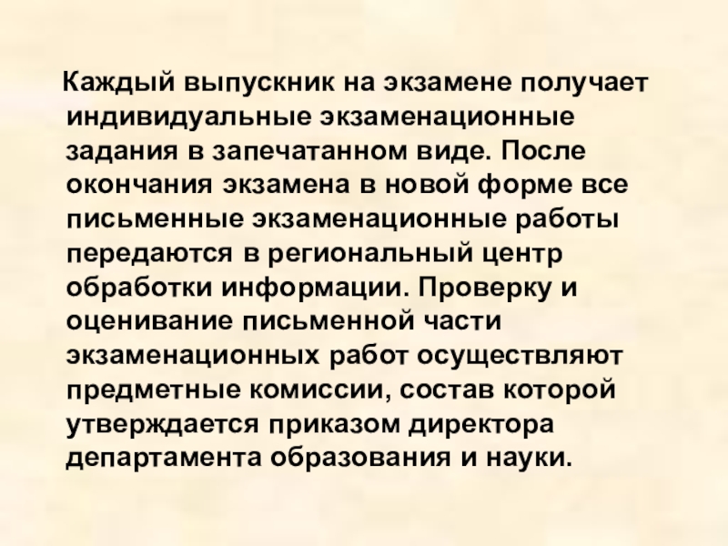запечатанном виде. После окончания экзамена в новой форме все письменные экзаменационные работы передаются в региональный центр обработки информации. Проверку и оценивание письменной части экзаменационных работ осуществляют предметные комиссии, состав которой утверждается приказом директора департамента образования и науки.
