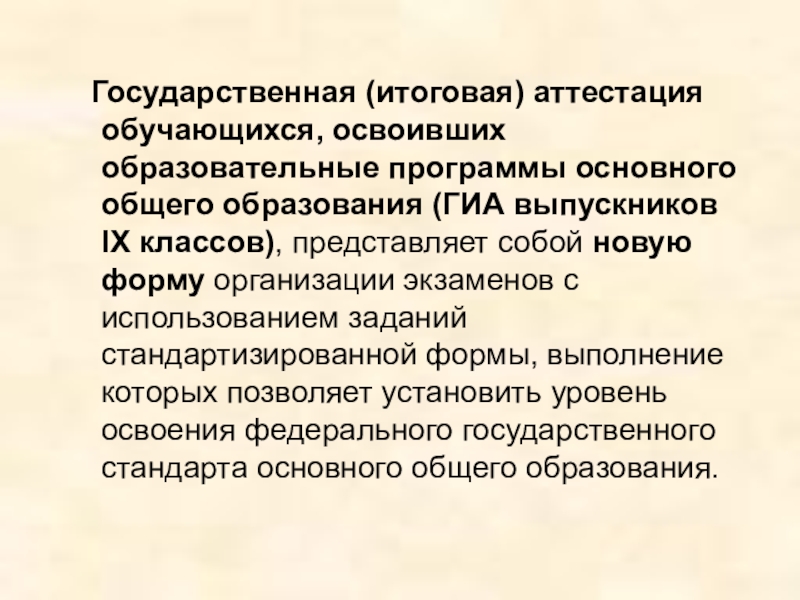 общего образования (ГИА выпускников IX классов), представляет собой новую форму организации экзаменов с использованием заданий стандартизированной формы, выполнение которых позволяет установить уровень освоения федерального государственного стандарта основного общего образования.