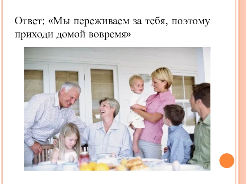 Слайд 16Ответ: «Мы переживаем за тебя, поэтому приходи домой вовремя»