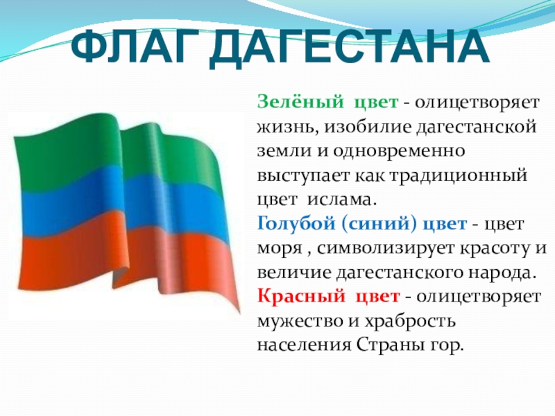ФЛАГ ДАГЕСТАНАЗелёный цвет - олицетворяет жизнь, изобилие дагестанской земли и одновременно выступает как традиционный цвет  ислама.Голубой (синий) цвет
