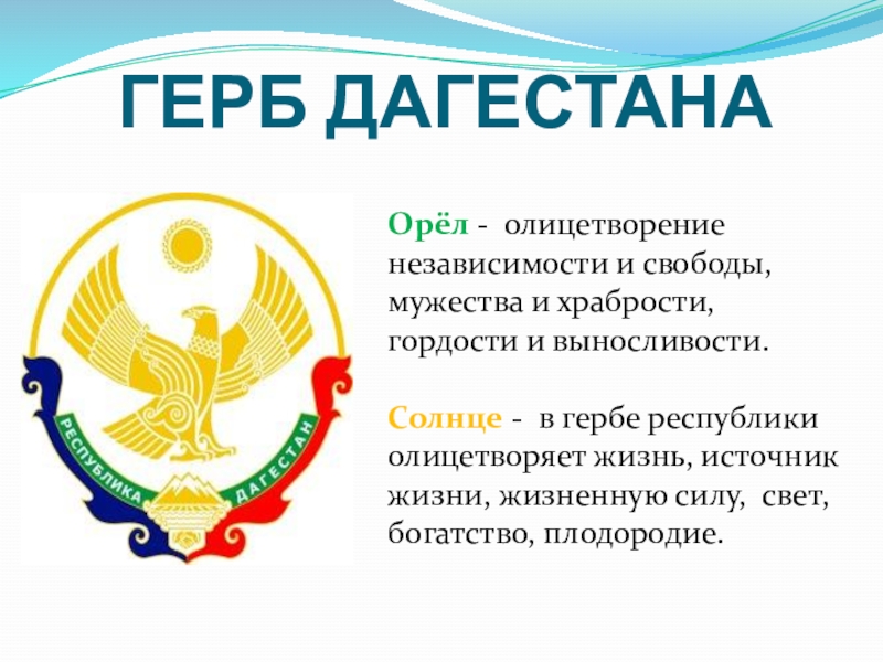 ГЕРБ ДАГЕСТАНАОрёл -  олицетворение независимости и свободы, мужества и храбрости, гордости и выносливости. Солнце -  в гербе