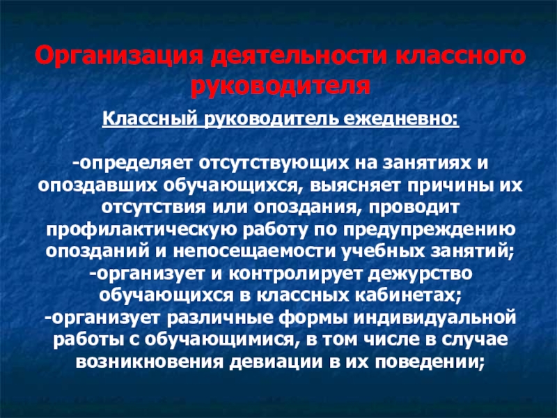 обучающихся, выясняет причины их отсутствия или опоздания, проводит профилактическую работу по предупреждению опозданий и непосещаемости учебных занятий;