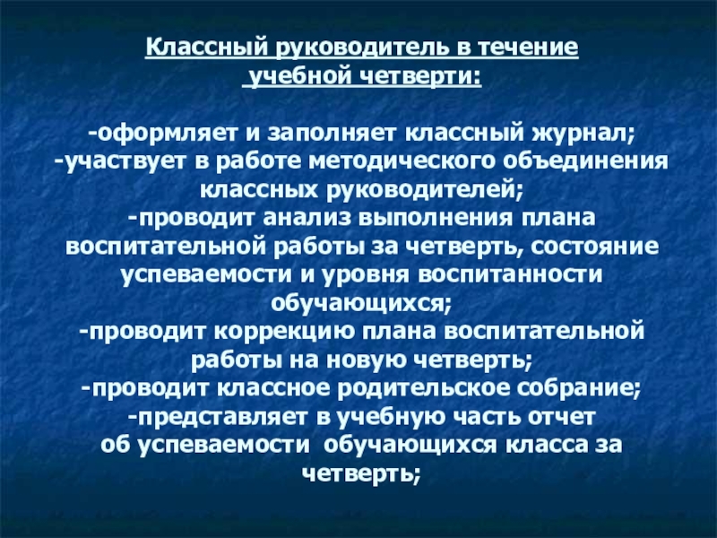 -проводит анализ выполнения плана воспитательной работы за четверть, состояние успеваемости и уровня воспитанности обучающихся;