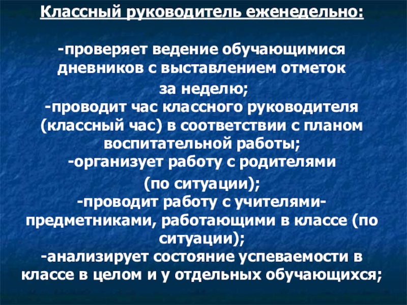 Слайд 20Классный руководитель еженедельно: