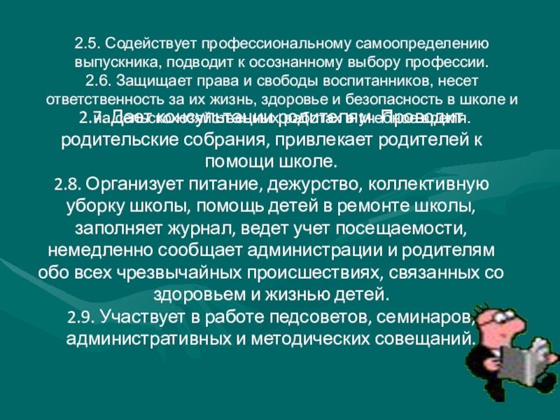 2.8. Организует питание, дежурство, коллективную уборку школы, помощь детей в ремонте школы, заполняет журнал, ведет учет посещаемости, немедленно сообщает администрации и родителям обо всех чрезвычайных происшествиях, связанных со здоровьем и жизнью детей.