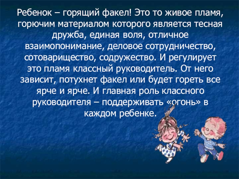 является тесная дружба, единая воля, отличное взаимопонимание, деловое сотрудничество, сотоварищество, содружество. И регулирует это пламя классный руководитель. От него зависит, потухнет факел или будет гореть все ярче и ярче. И главная роль классного руководителя – поддерживать «огонь» в каждом ребенке.