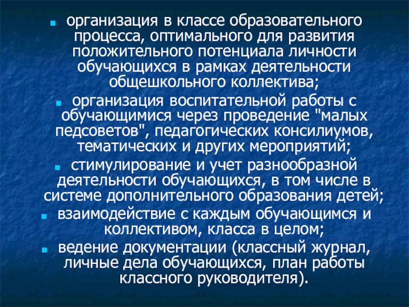 Слайд 12организация в классе образовательного процесса, оптимального для развития положительного потенциала личности
