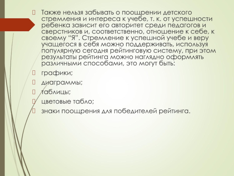 Слайд 14Также нельзя забывать о поощрении детского стремления и интереса к учебе,