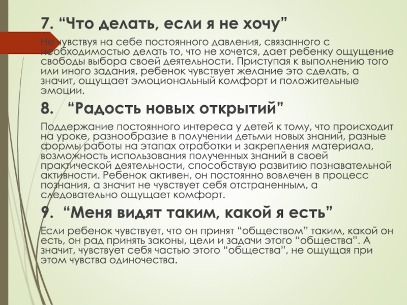 давления, связанного с необходимостью делать то, что не хочется, дает ребенку ощущение свободы выбора своей деятельности. Приступая к выполнению того или иного задания, ребенок чувствует желание это сделать, а значит, ощущает эмоциональный комфорт и положительные эмоции.