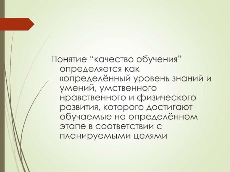 Слайд 2Понятие “качество обучения” определяется как «определённый уровень знаний и умений, умственного