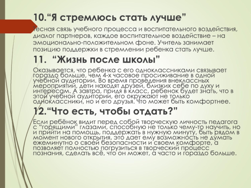 партнеров, каждое воспитательное воздействие – на эмоционально-положительном фоне. Учитель занимает позицию поддержки в стремлении ребенка стать лучше.