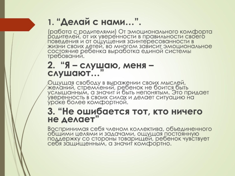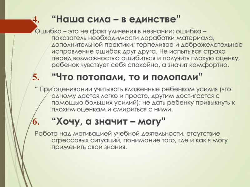 незнании; ошибка – показатель необходимости доработки материала, дополнительной практики; терпеливое и доброжелательное исправление ошибок друг друга. Не испытывая страха перед возможностью ошибиться и получить плохую оценку, ребенок чувствует себя спокойно, а значит комфортно.