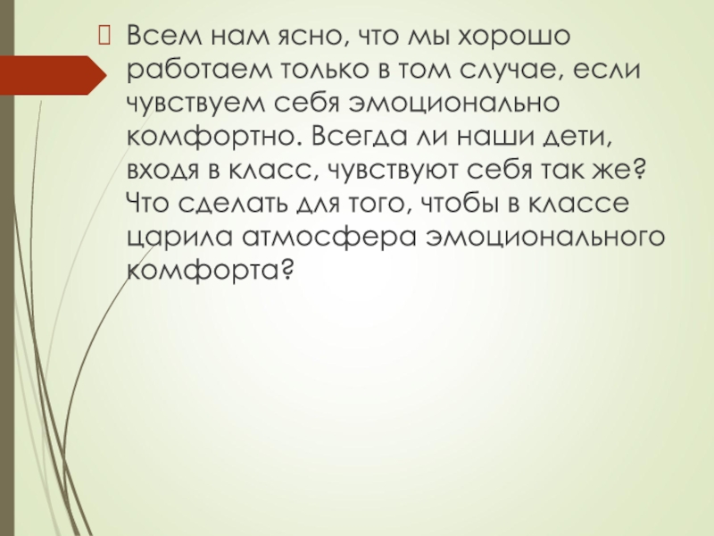 если чувствуем себя эмоционально комфортно. Всегда ли наши дети, входя в класс, чувствуют себя так же? Что сделать для того, чтобы в классе царила атмосфера эмоционального комфорта?