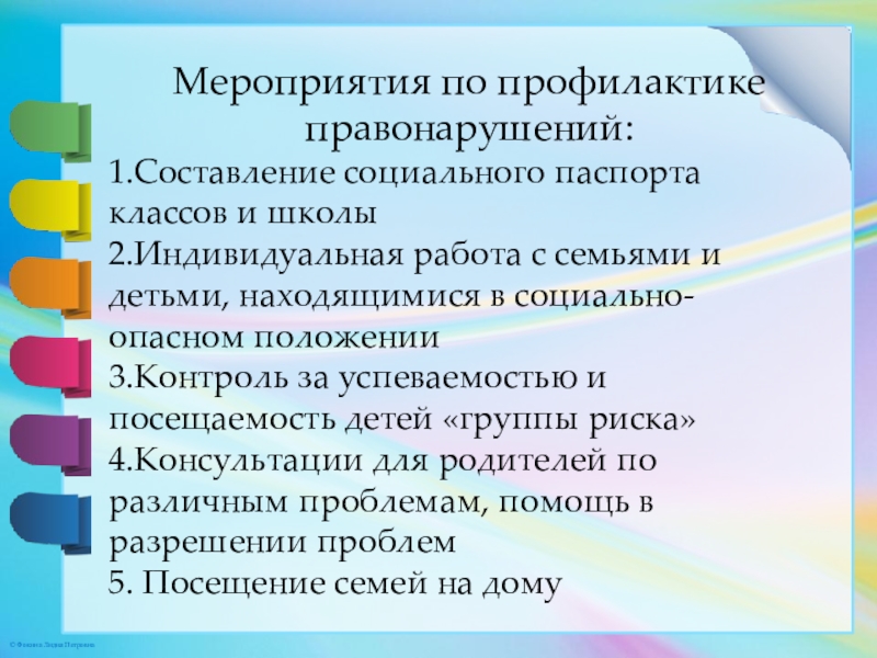 Мероприятия по профилактике правонарушений:1.Составление социального паспорта классов и школы2.Индивидуальная работа с семьями и детьми, находящимися в социально-опасном