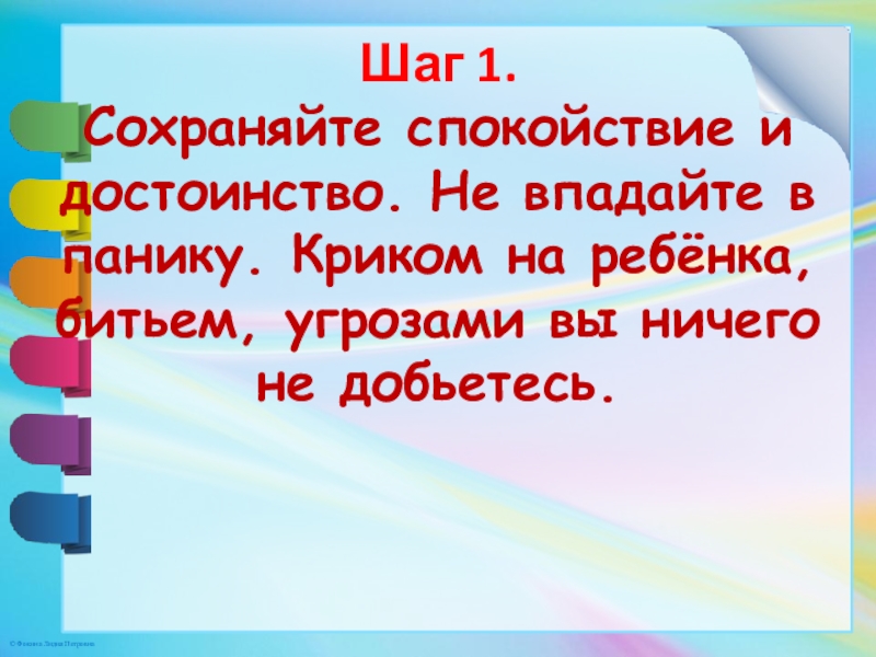 Шаг 1. Сохраняйте спокойствие и достоинство. Не впадайте в панику. Криком на ребёнка, битьем, угрозами вы ничего
