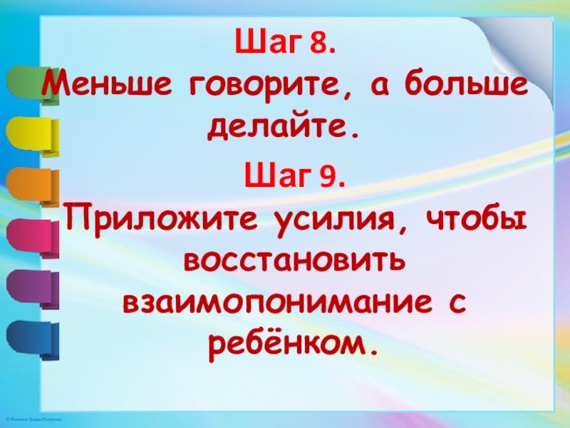 Шаг 8. Меньше говорите, а больше делайте. Шаг 9. Приложите усилия, чтобы восстановить взаимопонимание с ребёнком.
