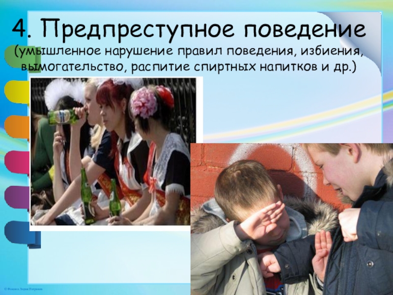 4. Предпреступное поведение (умышленное нарушение правил поведения, избиения, вымогательство, распитие спиртных напитков и др.)