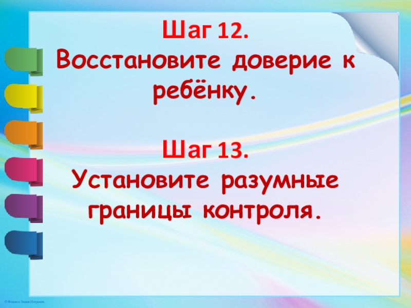 Слайд 21Шаг 12. Восстановите доверие к ребёнку. Шаг 13. Установите разумные границы контроля.