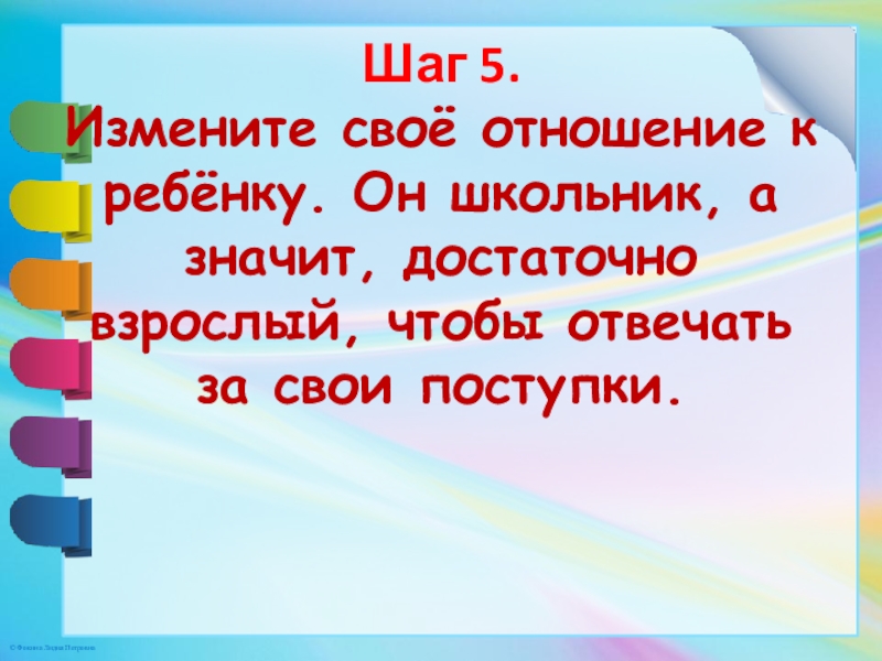 Слайд 17Шаг 5. Измените своё отношение к ребёнку. Он школьник, а значит, достаточно
