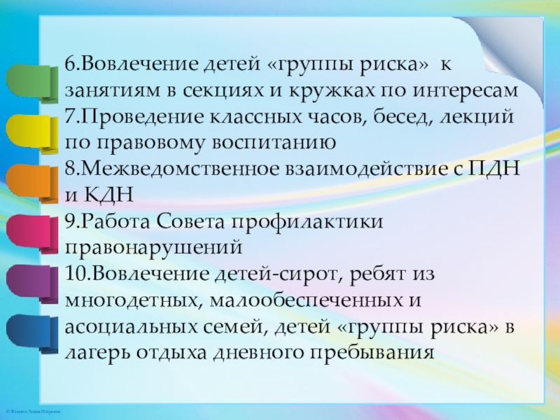 6.Вовлечение детей «группы риска» к занятиям в секциях и кружках по интересам7.Проведение классных часов, бесед, лекций по