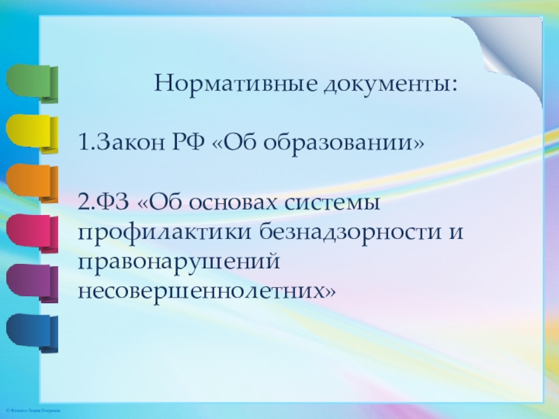 Нормативные документы:1.Закон РФ «Об образовании»2.ФЗ «Об основах системы профилактики безнадзорности и правонарушений несовершеннолетних»
