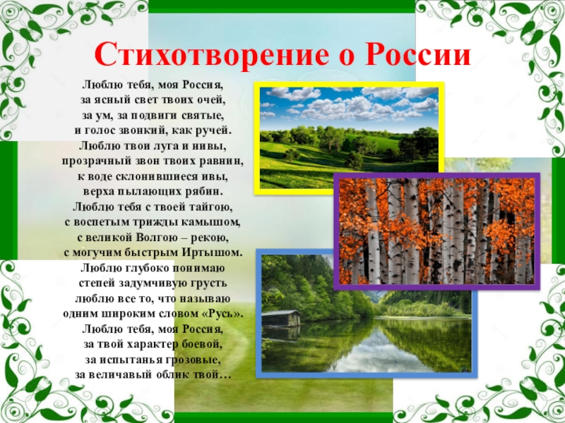 за подвиги святые, и голос звонкий, как ручей. Люблю твои луга и нивы, прозрачный звон твоих равнин, к воде склонившиеся ивы, верха пылающих рябин. Люблю тебя с твоей тайгою, с воспетым трижды камышом, с великой Волгою – рекою, с могучим быстрым Иртышом. Люблю глубоко понимаю степей задумчивую грусть люблю все то, что называю одним широким словом «Русь». Люблю тебя, моя Россия, за твой характер боевой, за испытанья грозовые, за величавый облик твой…