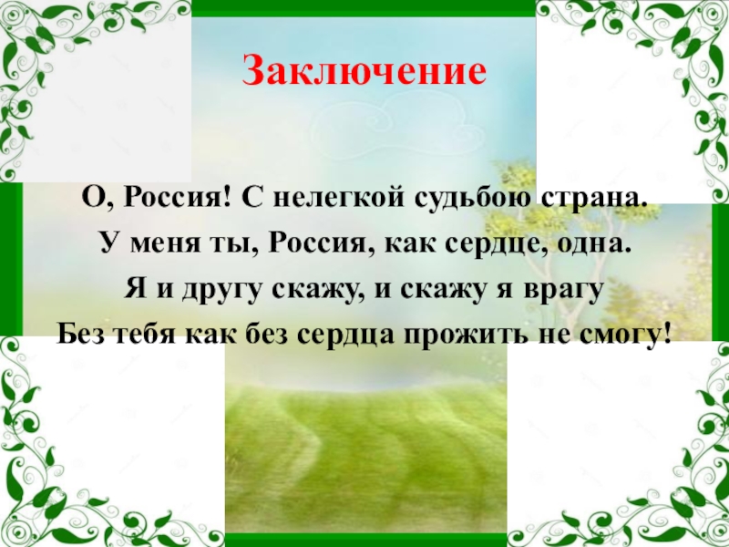 ЗаключениеО, Россия! С нелегкой судьбою страна.У меня ты, Россия, как сердце, одна.Я и другу скажу, и скажу