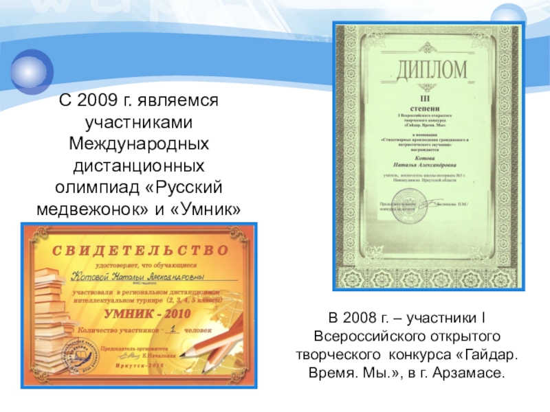 В 2008 г. – участники I Всероссийского открытого творческого конкурса «Гайдар. Время. Мы.», в г. Арзамасе.