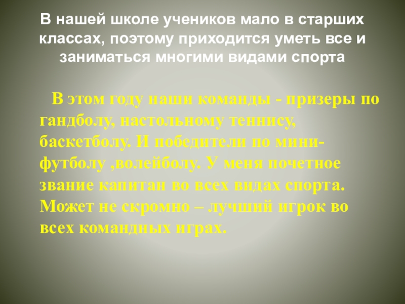 В этом году наши команды - призеры по гандболу, настольному теннису, баскетболу. И победители по мини-футболу ,волейболу. У меня почетное звание капитан во всех видах спорта. Может не скромно – лучший игрок во всех командных играх.