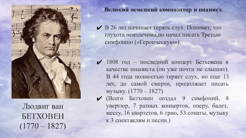 1808 год – последний концерт Бетховена в качестве пианиста (он уже почти не слышит). В 44 года полностью теряет слух, но еще 13 лет, до самой смерти, продолжает писать музыку. (1770 – 1827)