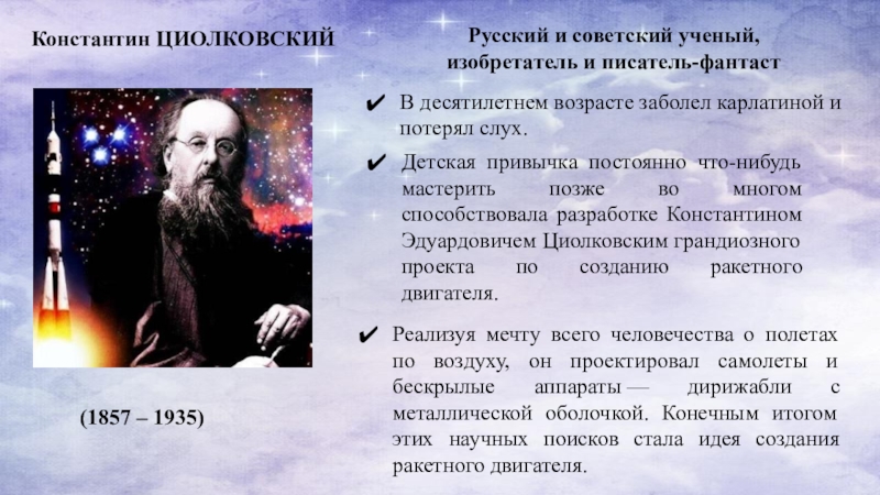 Реализуя мечту всего человечества о полетах по воздуху, он проектировал самолеты и бескрылые аппараты — дирижабли с металлической оболочкой. Конечным итогом этих научных поисков стала идея создания ракетного двигателя.