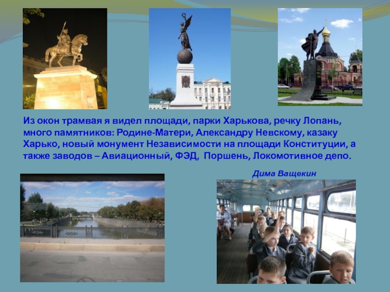 Слайд 4Из окон трамвая я видел площади, парки Харькова, речку Лопань, много