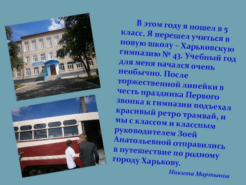 В этом году я пошел в 5 класс. Я перешел учиться в новую школу – Харьковскую гимназию № 43. Учебный год для меня начался очень необычно. После торжественной линейки в честь праздника Первого звонка к гимназии подъехал красивый ретро трамвай, и мы с классом и классным руководителем Зоей Анатольевной отправились в путешествие по родному городу Харькову.
