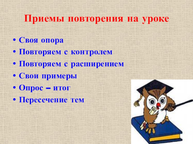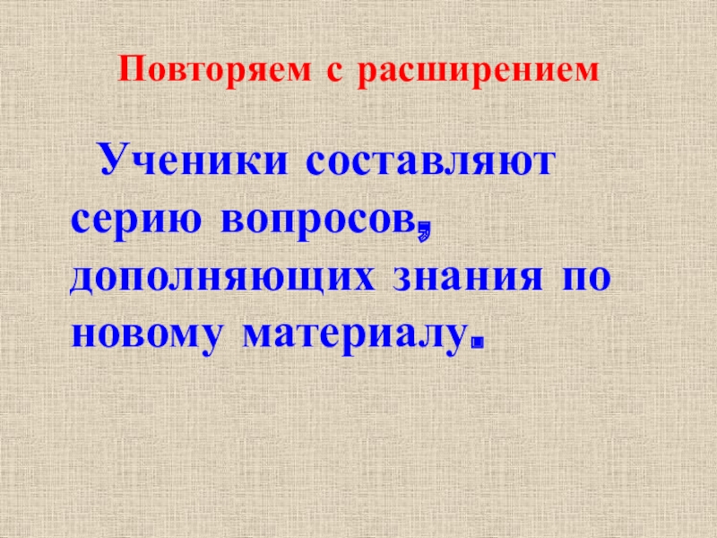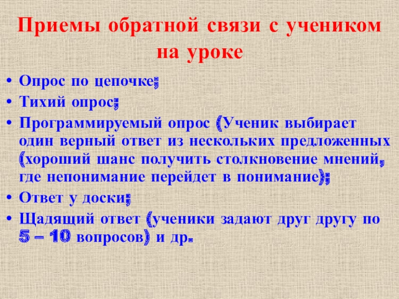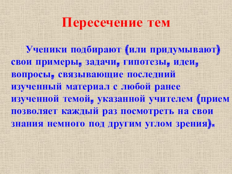 вопросы, связывающие последний изученный материал с любой ранее изученной темой, указанной учителем (прием позволяет каждый раз посмотреть на свои знания немного под другим углом зрения).