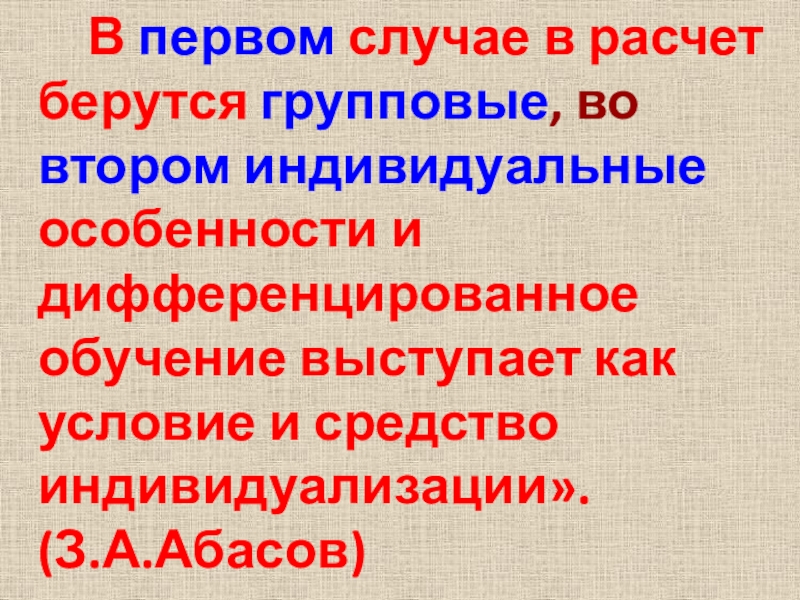 и дифференцированное обучение выступает как условие и средство индивидуализации». (З.А.Абасов)