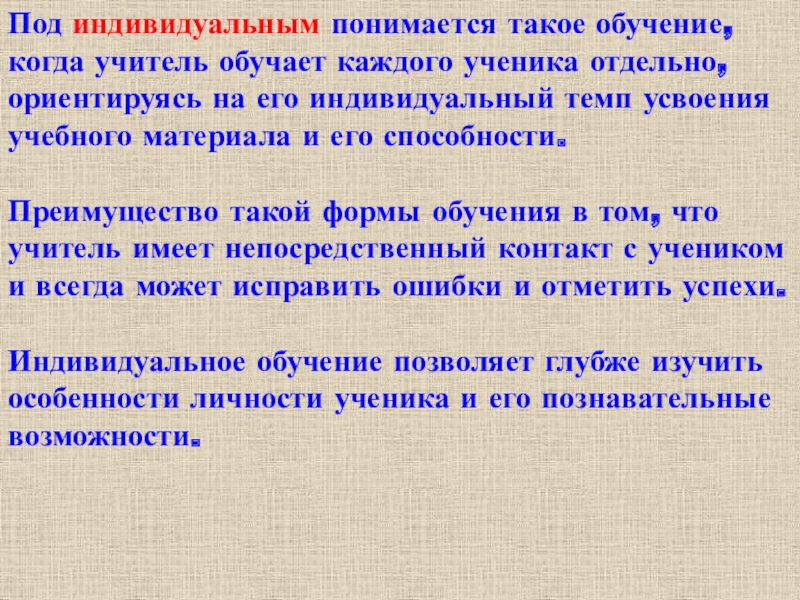 Слайд 16Под индивидуальным понимается такое обучение, когда учитель обучает каждого ученика отдельно, ориентируясь на