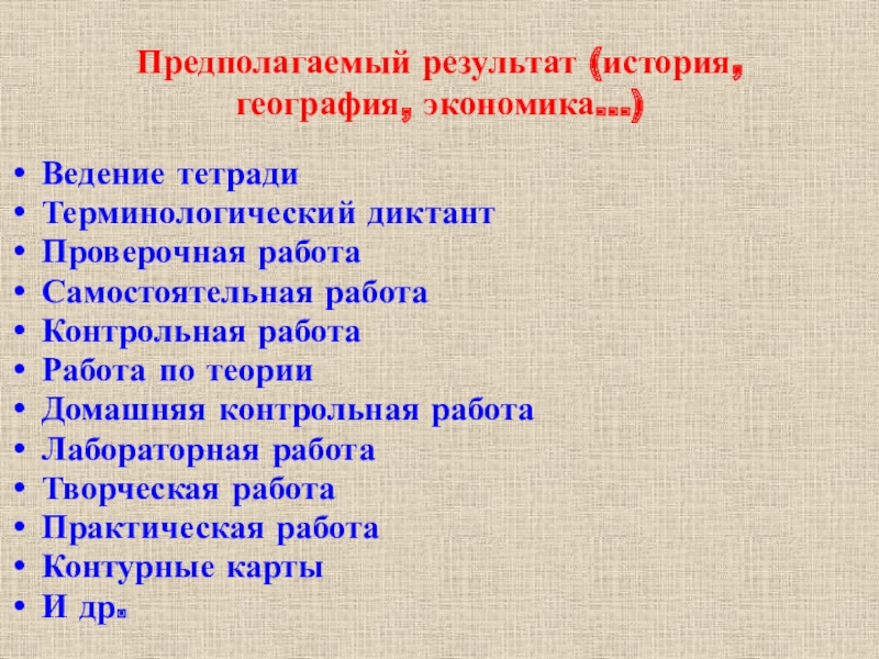 Слайд 46Предполагаемый результат (история, география, экономика…)