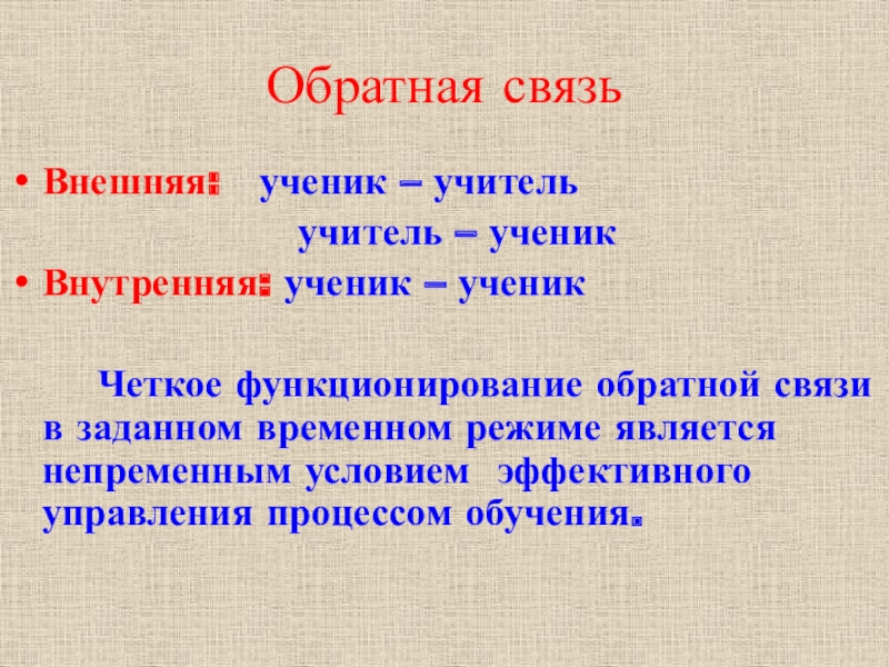 Четкое функционирование обратной связи в заданном временном режиме является непременным условием эффективного управления процессом обучения.