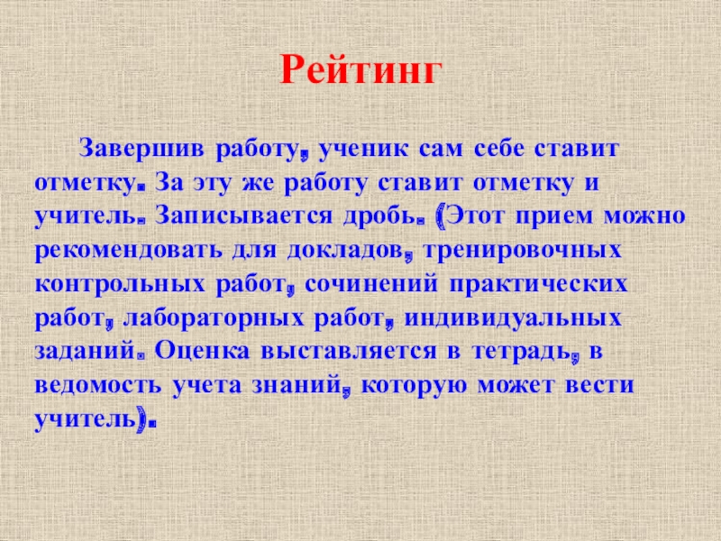 работу ставит отметку и учитель. Записывается дробь. (Этот прием можно рекомендовать для докладов, тренировочных контрольных работ, сочинений практических работ, лабораторных работ, индивидуальных заданий. Оценка выставляется в тетрадь, в ведомость учета знаний, которую может вести учитель).