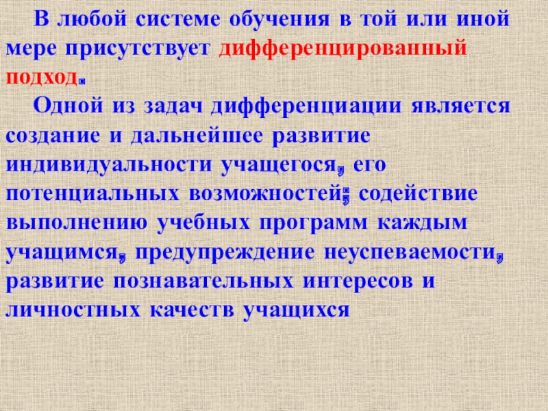 Слайд 20 В любой системе обучения в той или иной мере присутствует дифференцированный