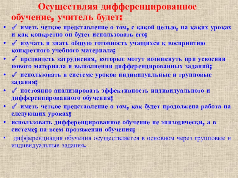 ✓ постоянно анализировать эффективность индивидуального и дифференцированного обучения;
