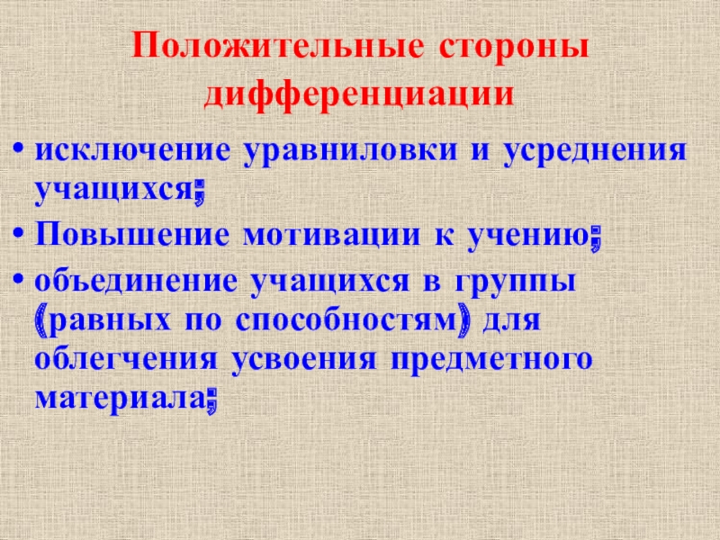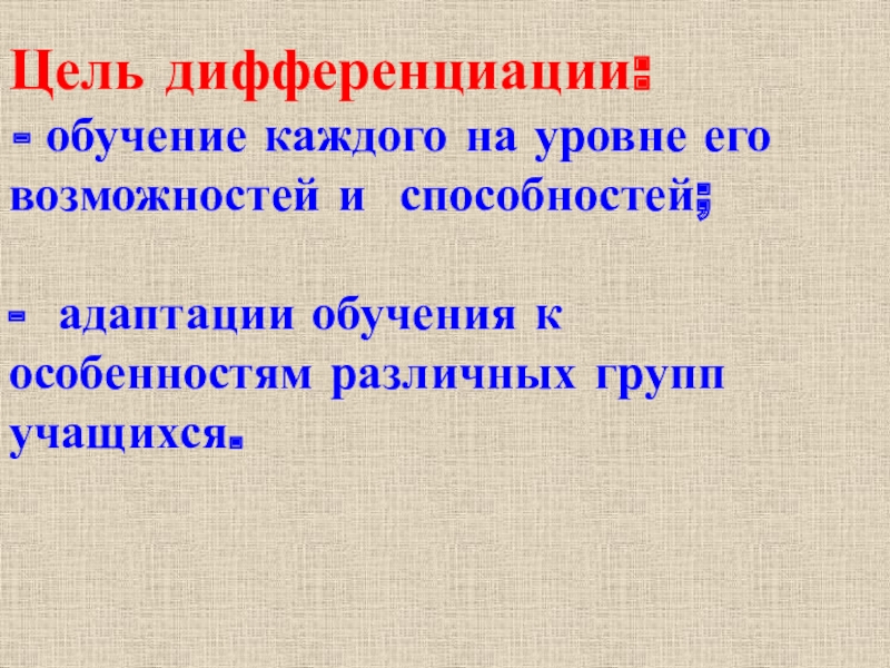 «Дифференциация – организация учебного процесса с учетом доминирующих особенностей групп учащихся».