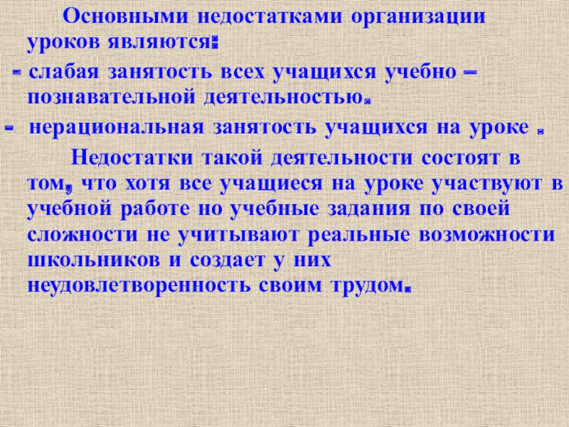 Недостатки такой деятельности состоят в том, что хотя все учащиеся на уроке участвуют в учебной работе но учебные задания по своей сложности не учитывают реальные возможности школьников и создает у них неудовлетворенность своим трудом.