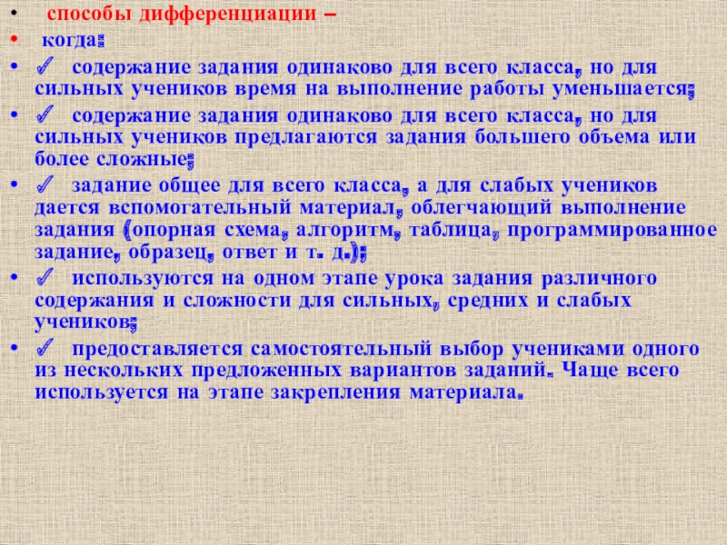 ✓ содержание задания одинаково для всего класса, но для сильных учеников предлагаются задания большего объема или более сложные;