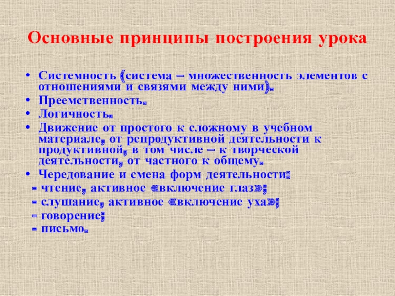 Движение от простого к сложному в учебном материале, от репродуктивной деятельности к продуктивной, в том числе – к творческой деятельности, от частного к общему.