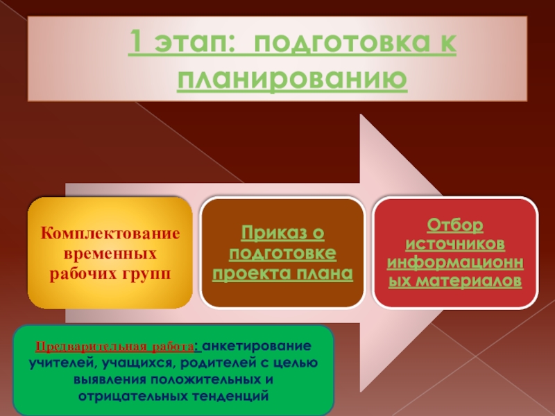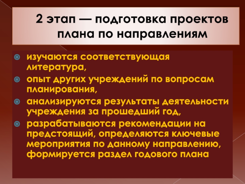 Слайд 102 этап — подготовка проектов плана по направлениям